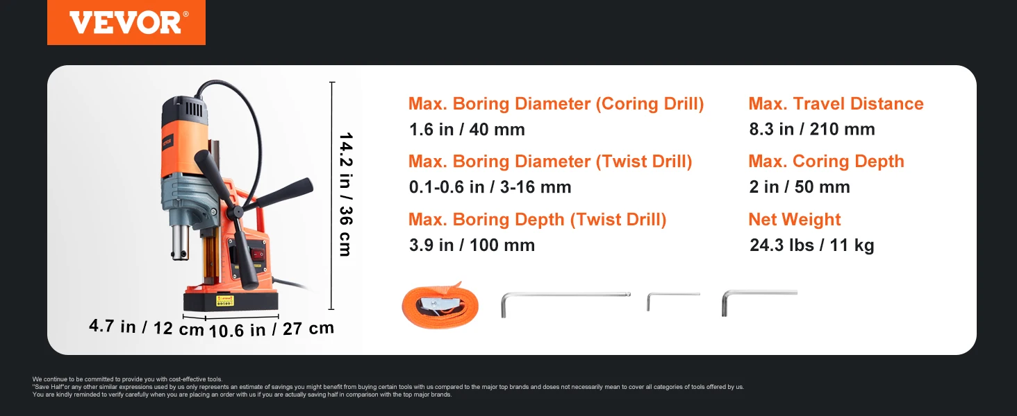 Top-level Magnet: Get ready for unstoppable power! This 1400W heavy-duty mag drill bores at 0-810 RPM up to 40mm/50mm depth and 40mm/50mm across, consistently generating enormous power to drill through rigid materials. 2922lbf / 13000N robust force created by the electromagnetic base on the two ends anchors the mag drill press solidly to avoid movement during the drilling process.